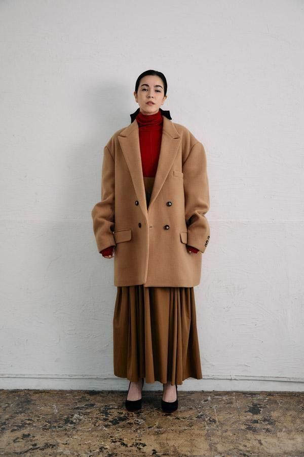 無骨なメンズライクなサイジングに対して、体に馴染む柔軟性のある生地を選ぶことで中性的なエレガントさが魅力的なジャケットです。