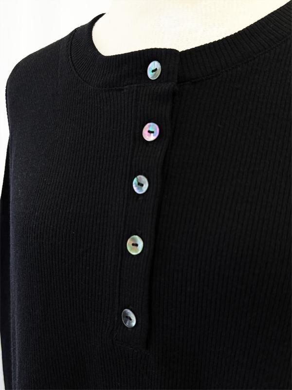 上品なシェルのイミテーションボタンがさりげないアクセントとなり、カジュアルな中にも洗練された印象をプラス。細部のこだわりが、全体のクオリティを高めています。